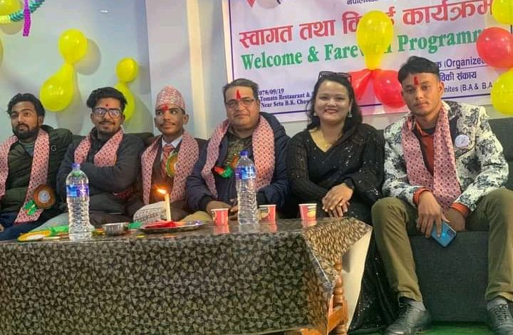 नेपालगन्ज-महेन्द्र बहुमुखी क्याम्पस नेपालगन्ज बाँकेको स्वागत तथा बिदाई कार्यक्रम आज सम्पन्न भएको छ ! मानविकि संकाय प्रथम बर्षका बिद्यार्थीहरुलाई स्वागत तथा अन्तिम बर्षका बिद्यार्थीहरुलाई बिदाई कार्यक्रम संयुक्त रुपमा सम्पन्न गरिएको हो !डम्बर विस्वकर्माको अध्यक्षतामा सम्पन्न भएको कार्यक्रममा प्रमुख अथिती पुर्व सहायक क्याम्पस प्रमुख तथा प्रध्यापक अर्जुन प्रसाद पोखरेल को रहेको थियो ! साथै सम्पुर्ण बिद्यार्थी संगठन का नेताहरुको समेत उपस्थिती रहेको थियो ! उक्त कार्यक्रम संचालन सुरेन्द्र रावल र कल्पना थापाले गरेका थिए ! स्वागत कार्यक्रम बाट आपसी समन्ध स्थापित तथा भावनात्मक समन्ध स्थापित हुने प्रमुख अतिथी अर्जुन पोखरेल ले बताउनु भयो !
